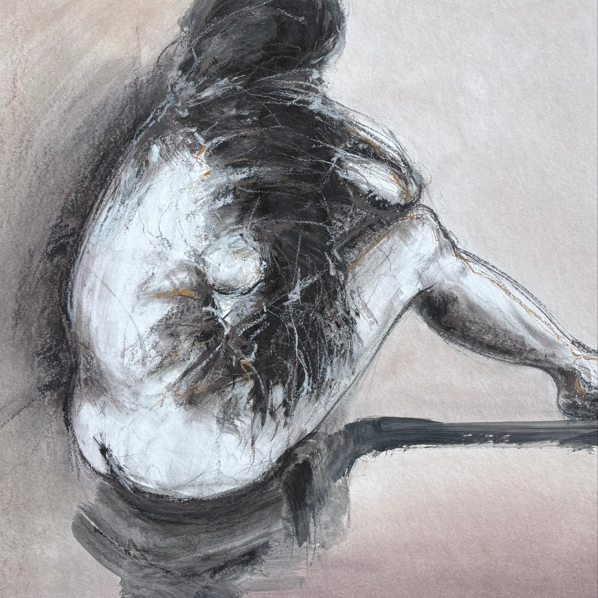 Travaillée d’après modèle vivant, la pièce capte le dos comme un paysage organique. Le pastel souligne les volumes, la pierre noire enracine les lignes, et l’encre fluidifie l’ensemble. Le résultat : une figure à la fois intime et sculpturale, où chaque trace participe à la construction d’une présence.
