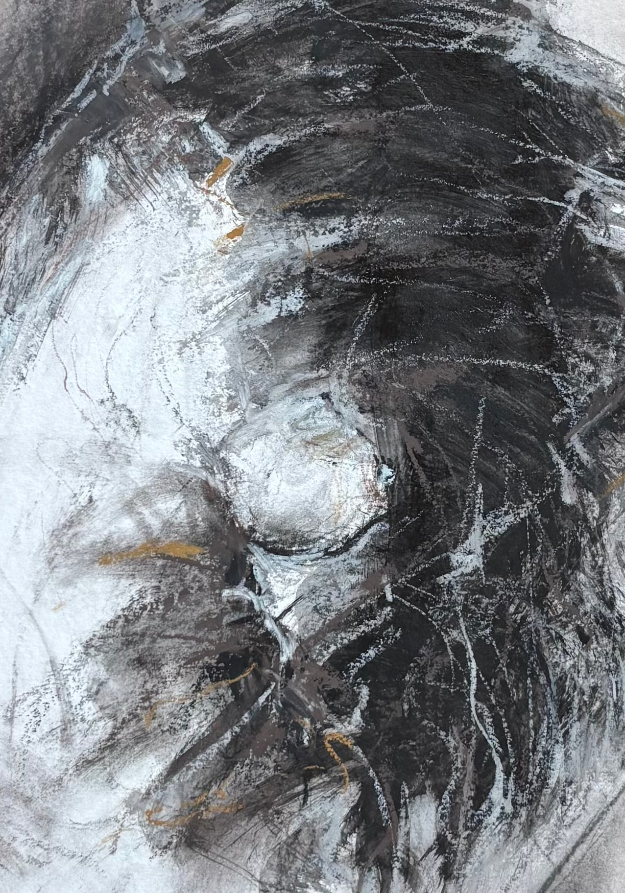 Réalisée à la main aux pastels, à la pierre noire et à l’encre de Chine, cette œuvre s’inscrit dans une démarche éthique et raisonnée. L’artiste privilégie des médiums simples et durables, associés à un papier de qualité. Chaque couche, chaque trace, est pensée comme l’expression d’un geste sobre et respectueux.