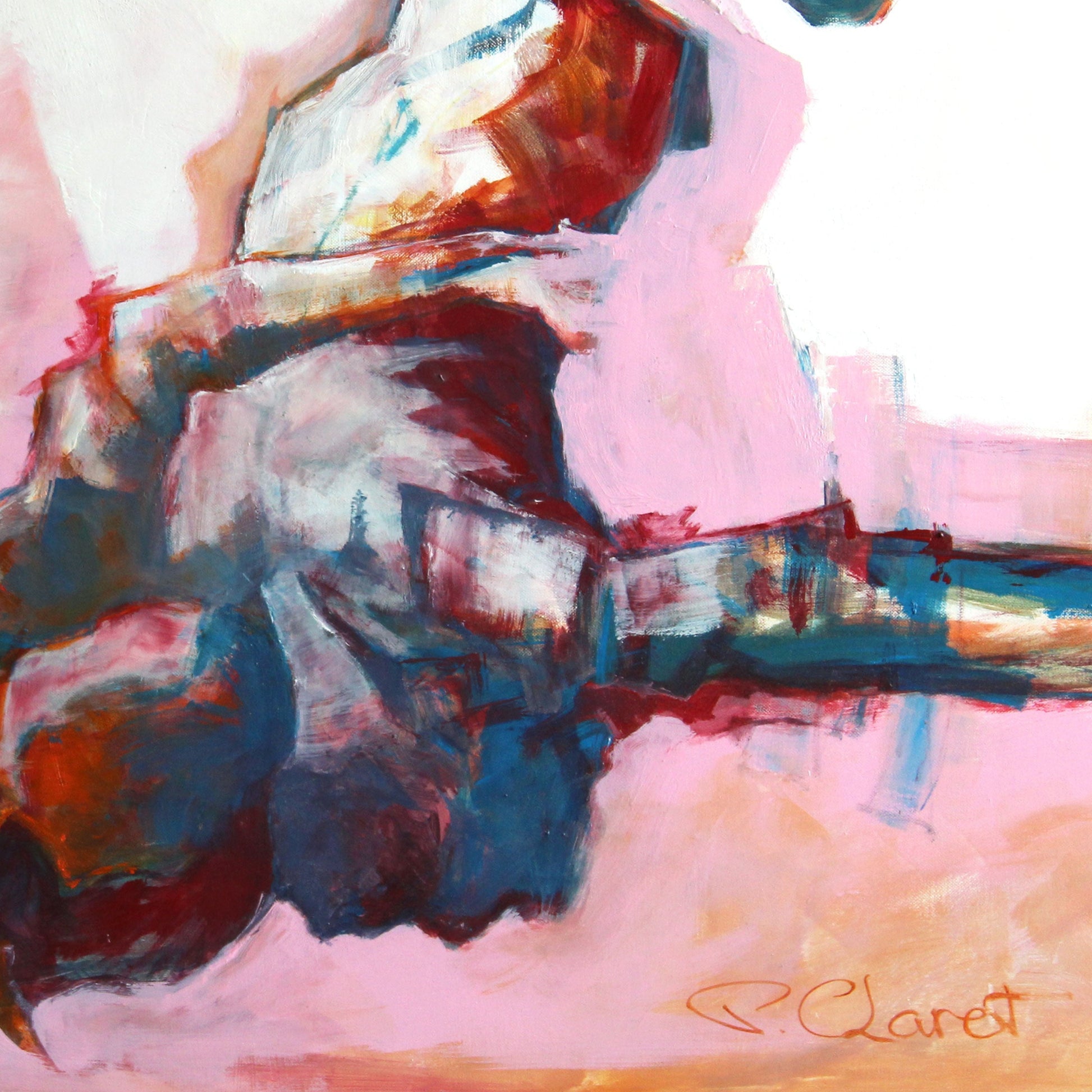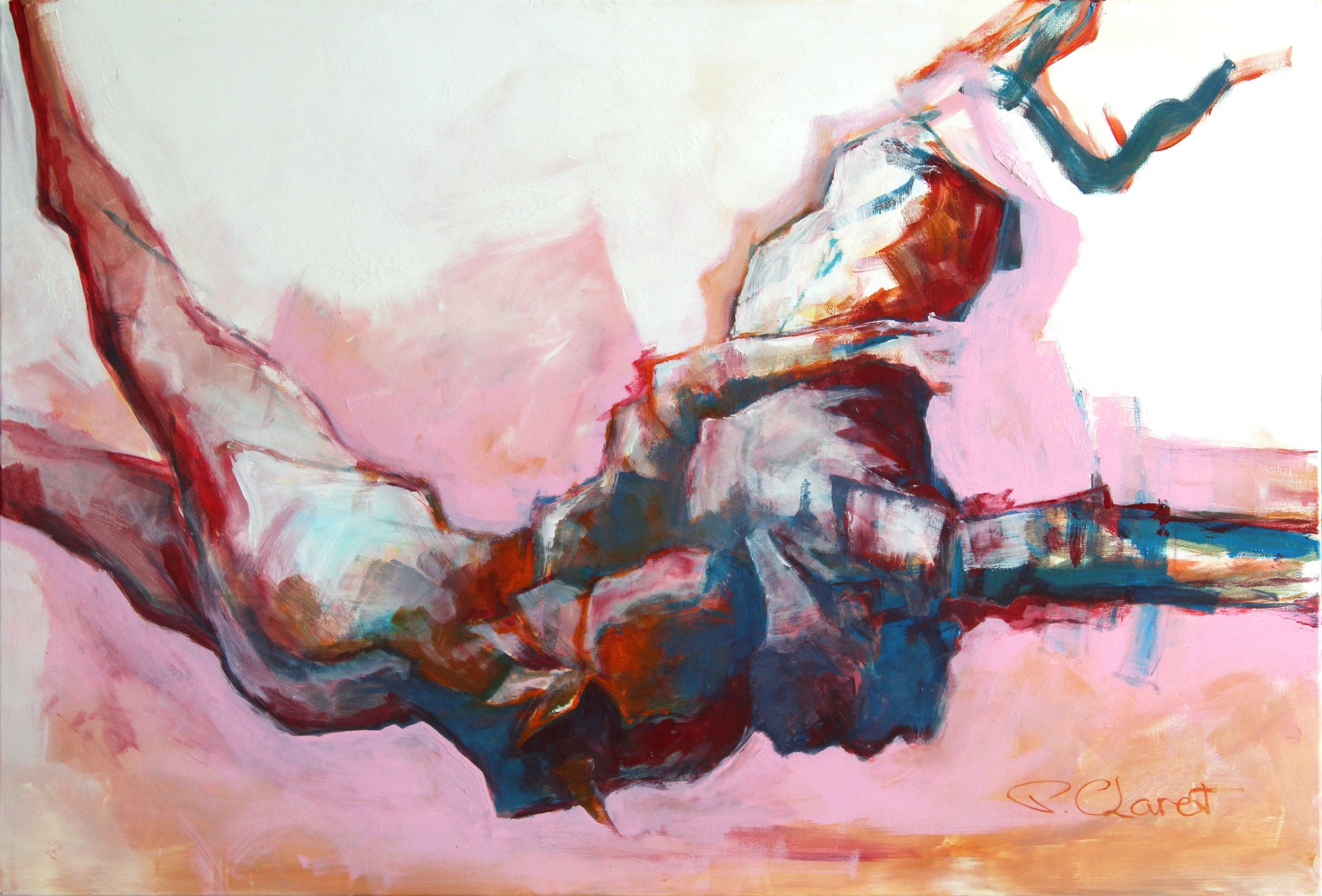 Deux corps fusionnent dans une étreinte intense, entre tendresse et rage. Une toile où le contraste des roses et des bleus amplifie la tension.