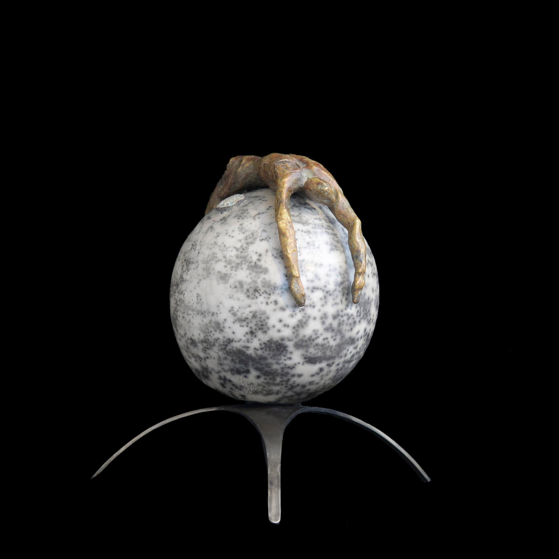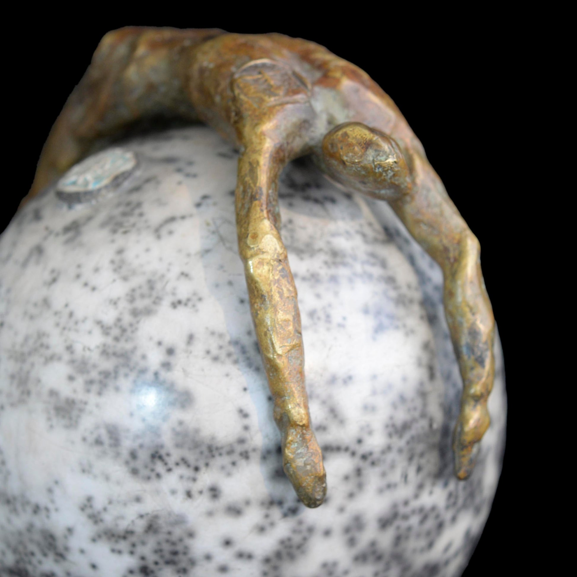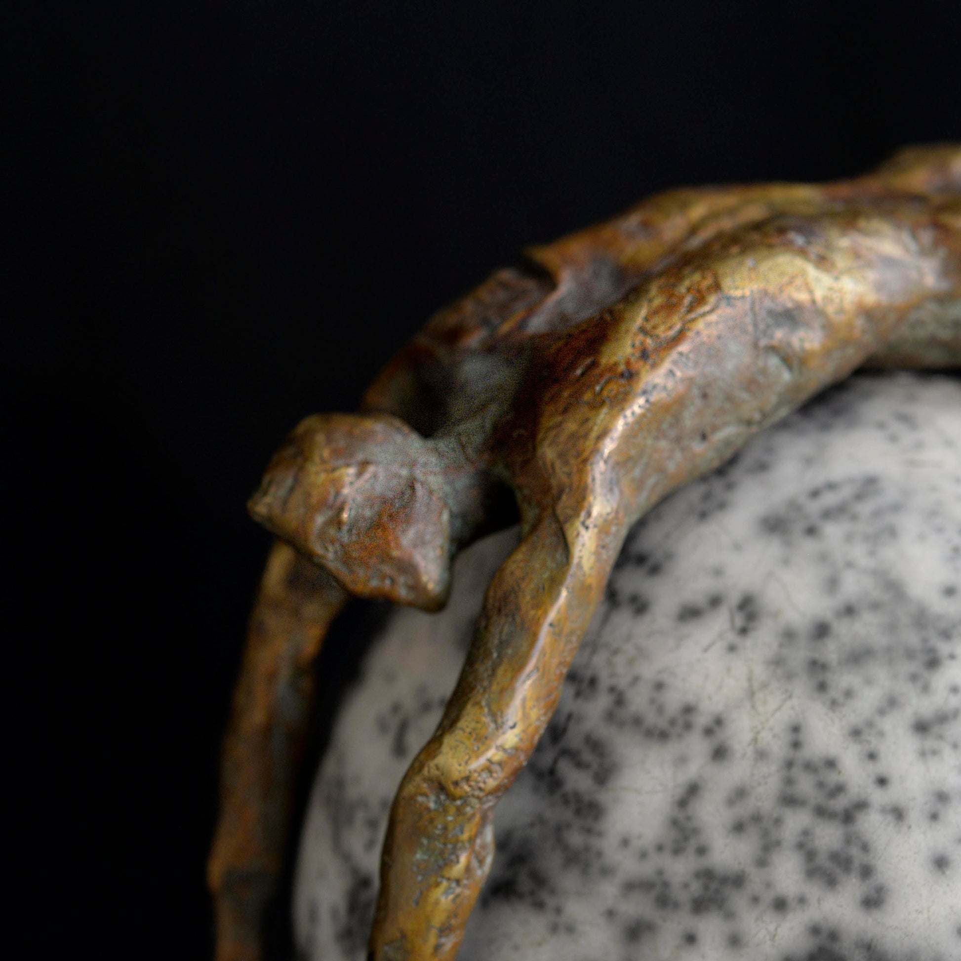 La figure, en bronze, repose de tout son poids sur une sphère en raku, une terre cuite à l’émail craquelé, brute et expressive. L’alliance du métal et de la terre crée une tension douce entre pesanteur et fragilité.