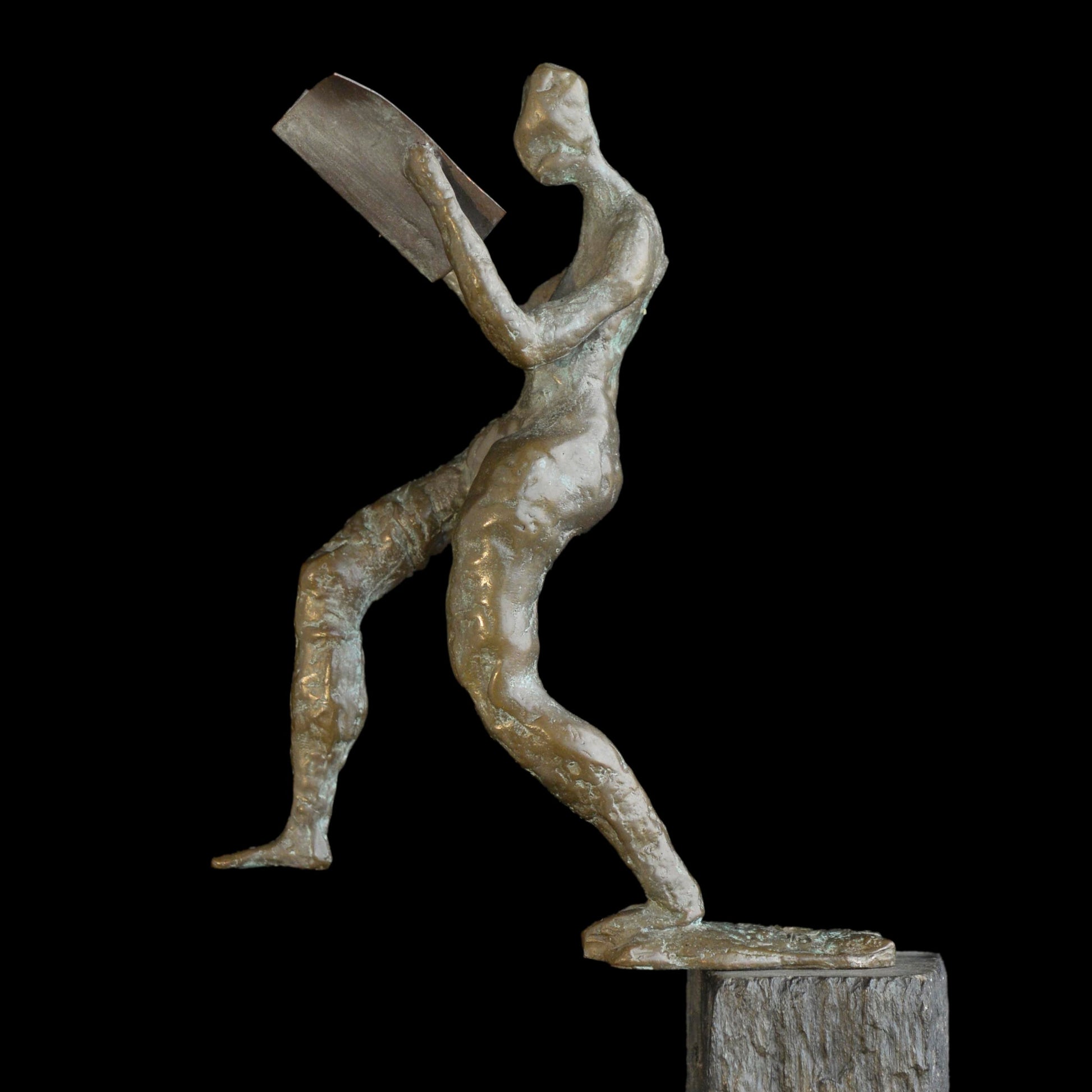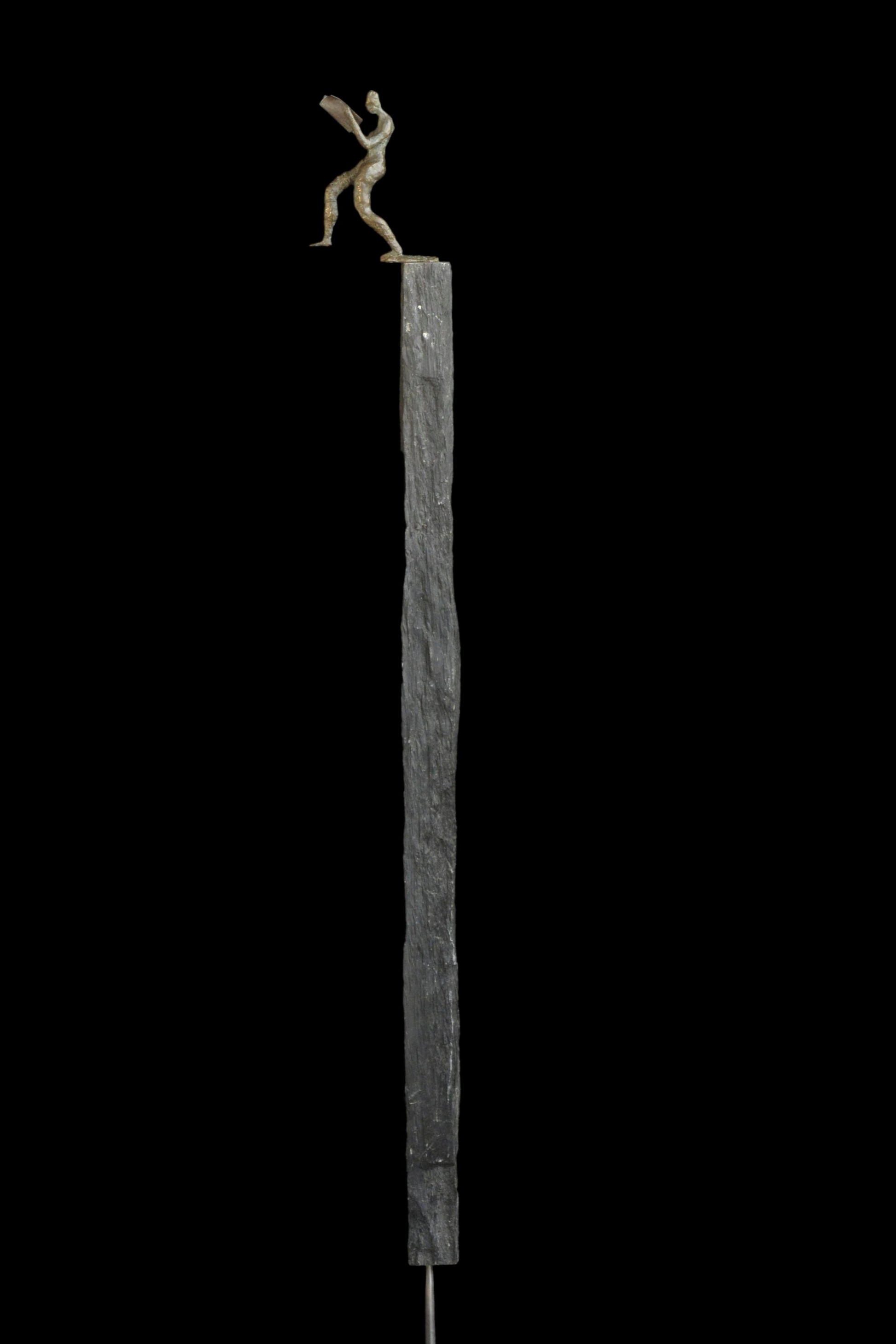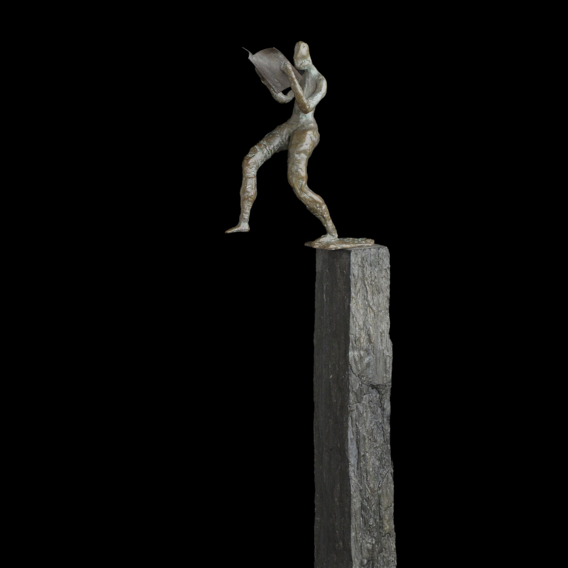 La figure, en bronze, repose sur un socle de pierre brute non polie, étiré dans la longueur. L’association des deux matières l’une travaillée, l’autre laissée dans son état d’origine, crée un contraste discret entre construction et nature.